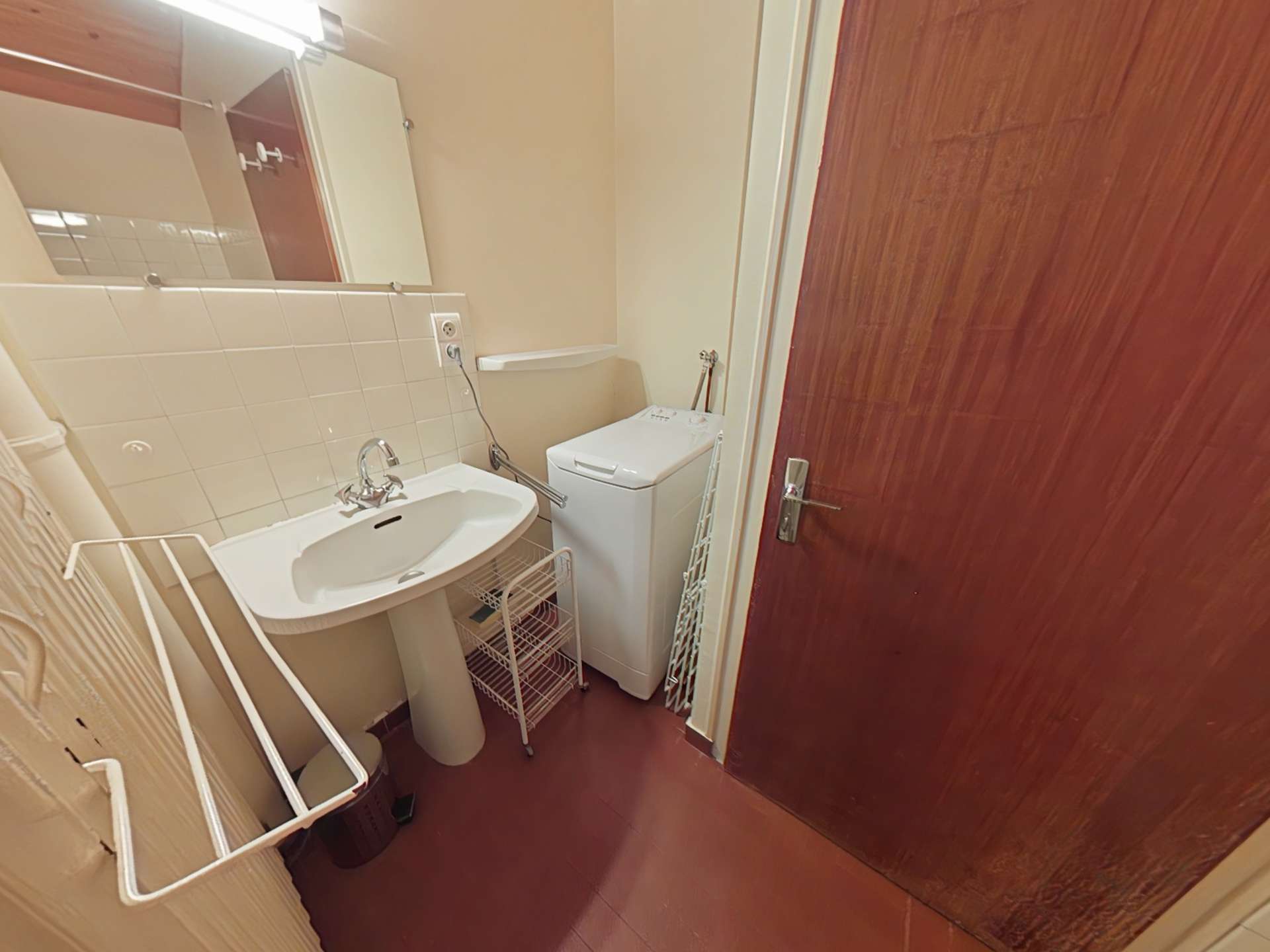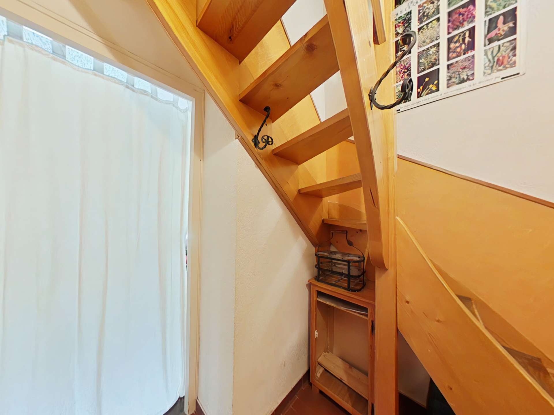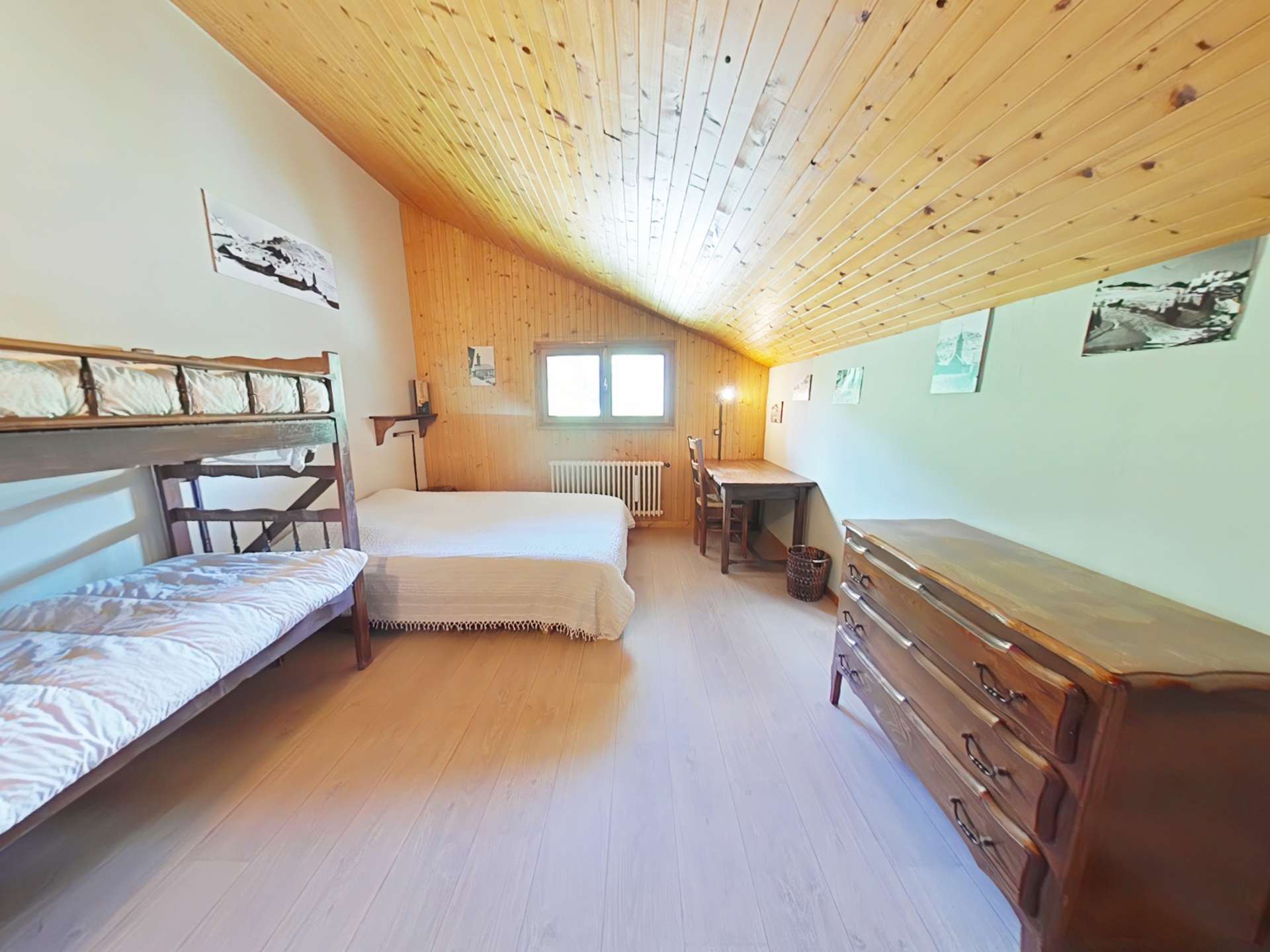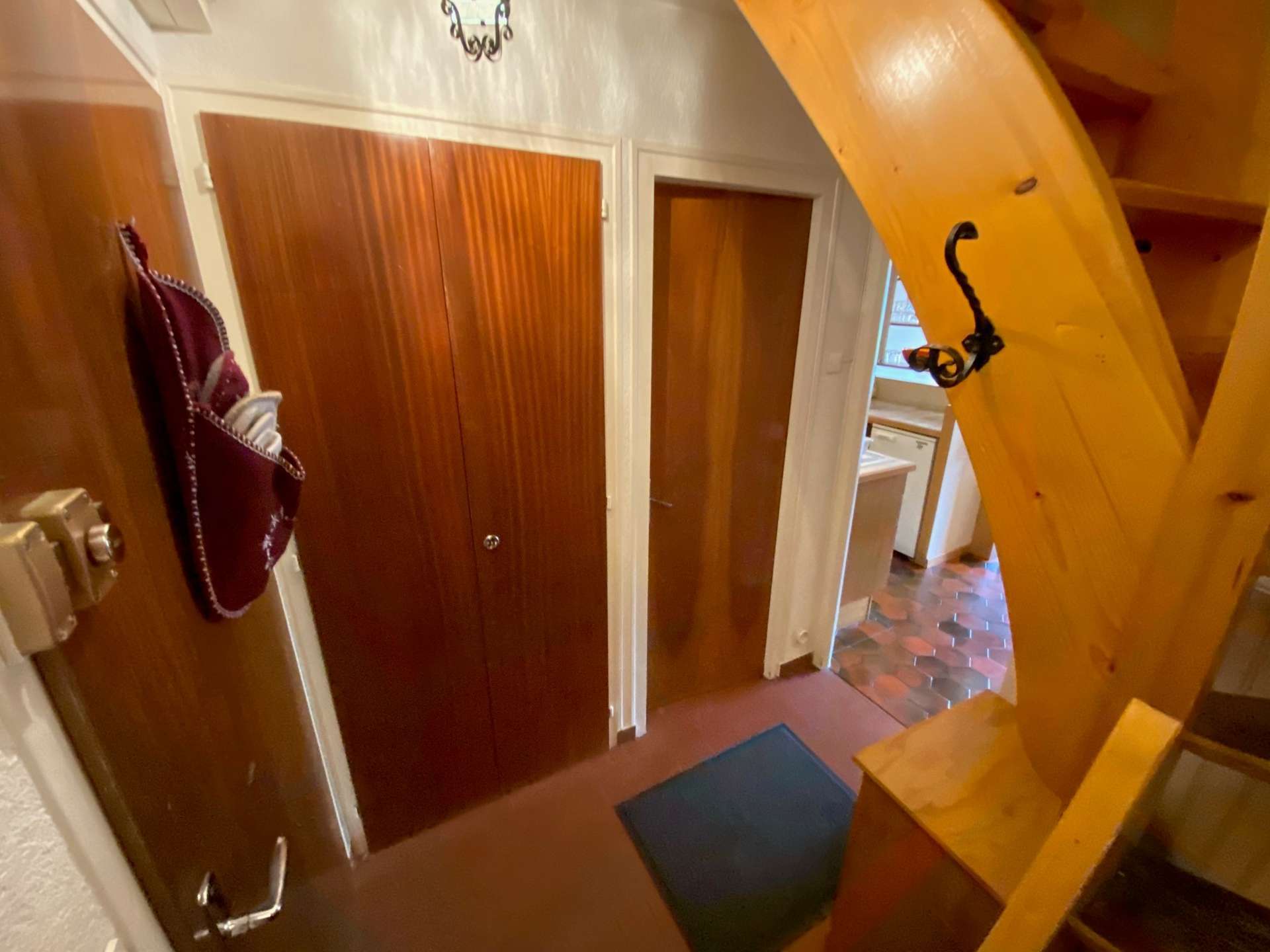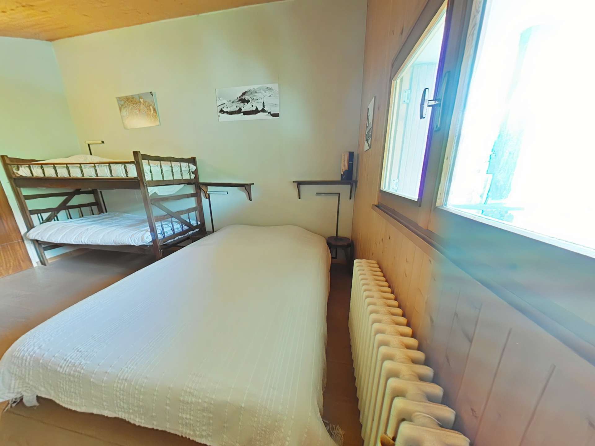 This vacation apartment, located on the 2nd floor, includes a living room with two single pull-out beds and a television, a fully equipped kitchenette with a dishwasher, and a separate toilet with a sink. Upstairs, there is a bedroom with a single bed (the bunk bed is not available on top) and a double bed, a bathroom with a washing machine, a south-facing balcony overlooking the ski slopes, and a private underground parking space. (Please note: the staircase is quite steep and does not have a railing for the few steps.)
