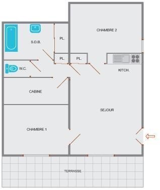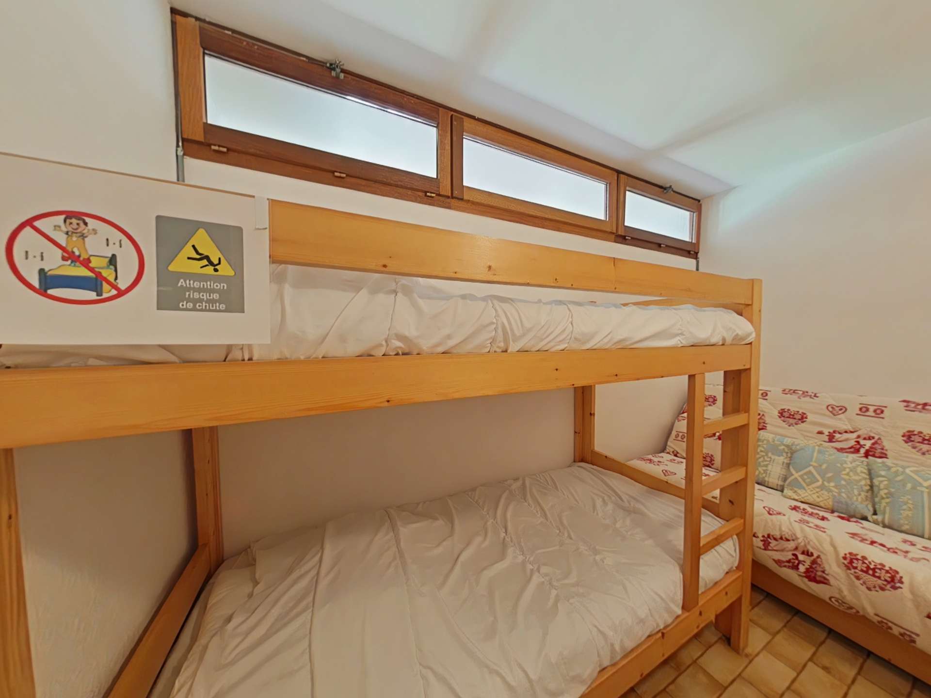 This ground-floor vacation apartment includes a living room with a seating area and television, a kitchenette equipped with a dishwasher, two bedrooms with a double bed, a sleeping alcove with two bunk beds, a bathroom with a washing machine, and a separate toilet.