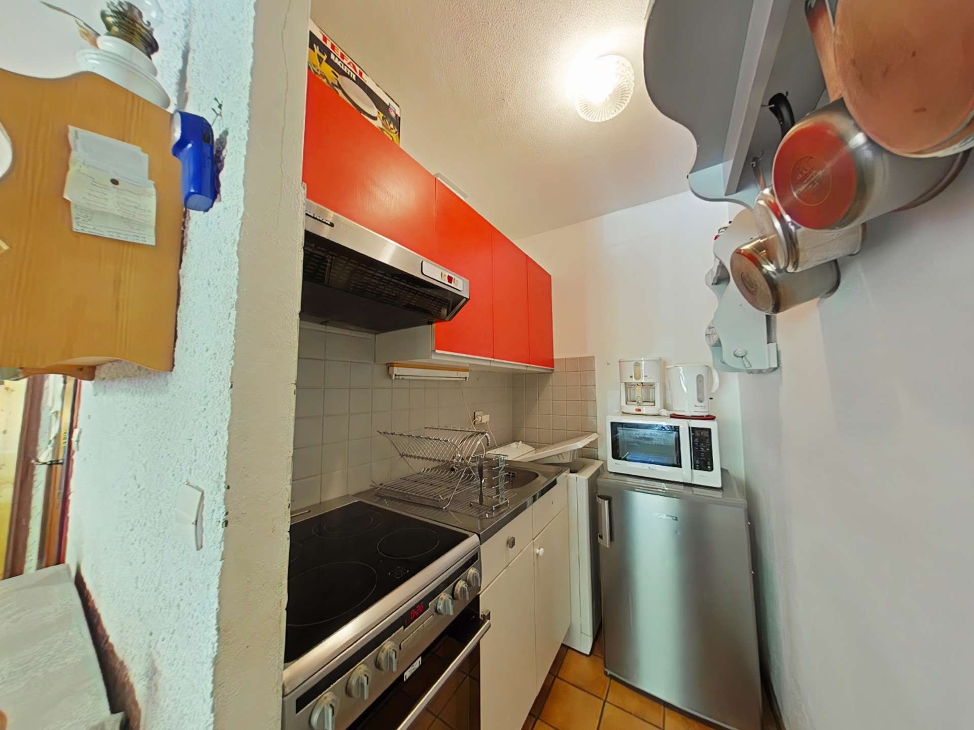 The Residence is located in the heart of the village, opposite the bus station and 200m from entertainment and shops. This holiday apartment, on the 1st floor with lift, consists of a living room with a rapido convertible sofa for 2 people and television opening onto a north balcony, an alcove with two bunk beds, a kitchenette equipped with a washing machine, a bathroom with hip bath and WC.